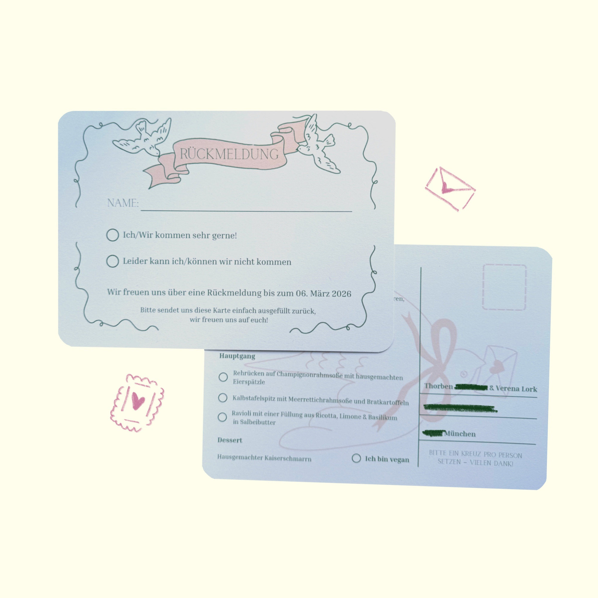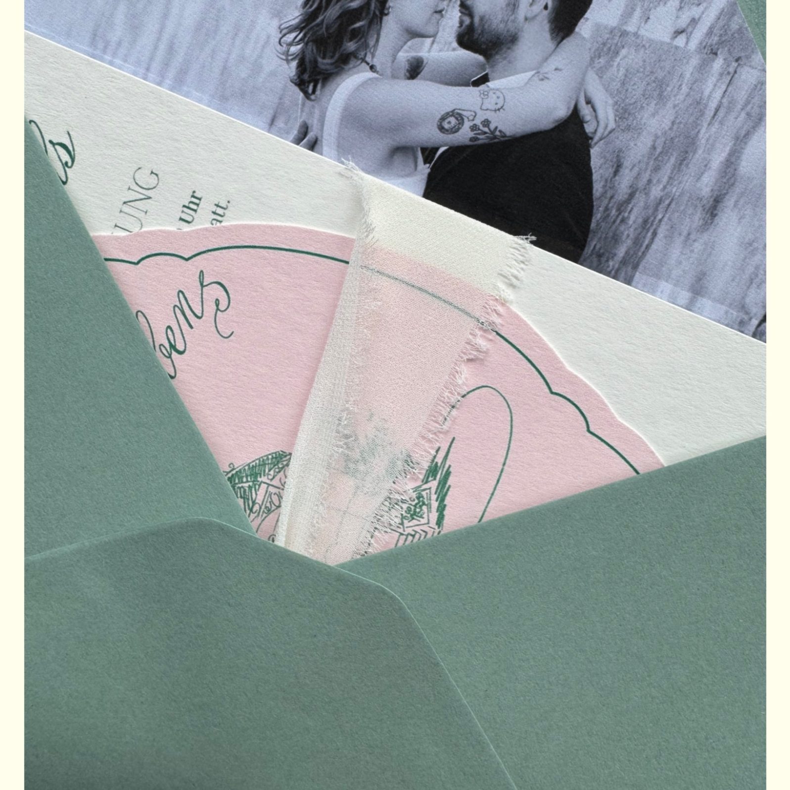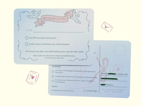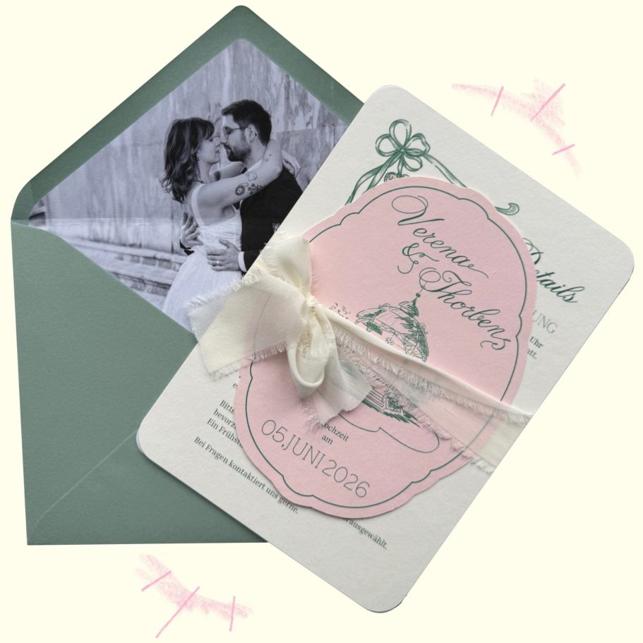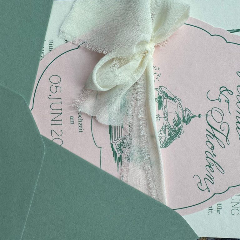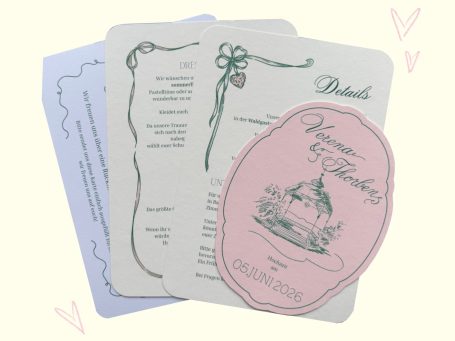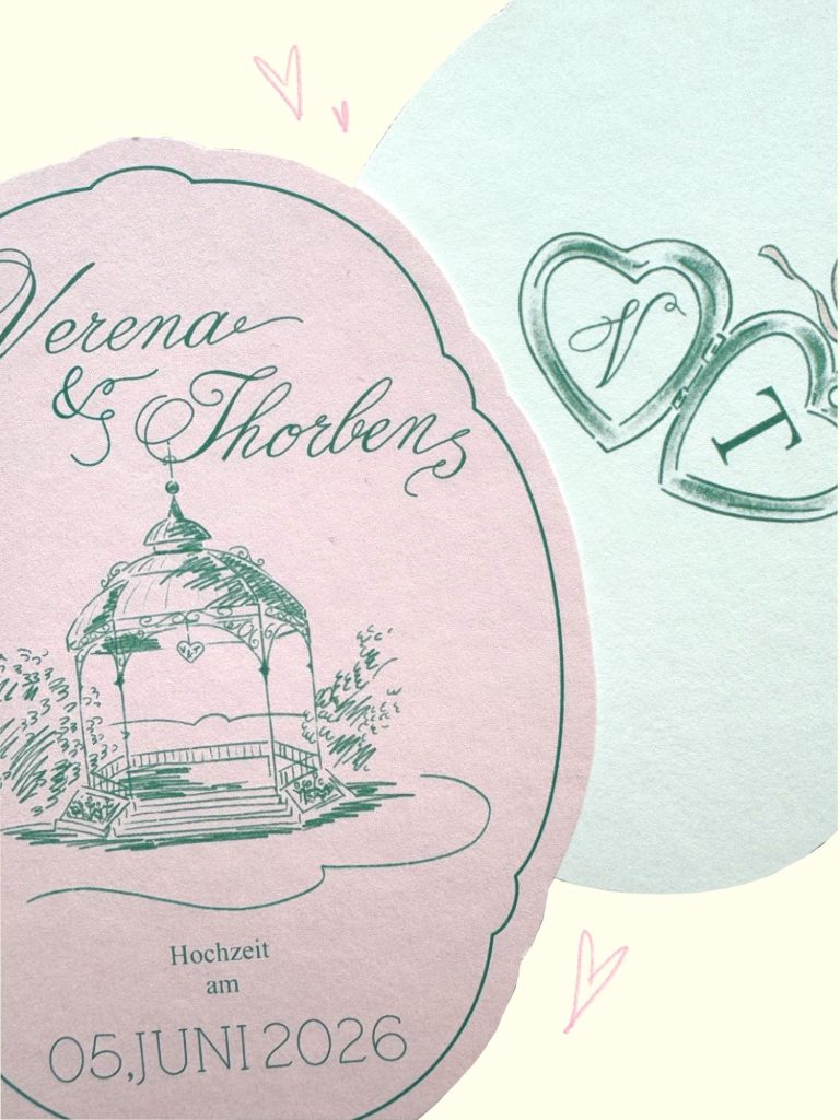 Anschließend melde ich mich bei euch und wir besprechen gemeinsam, was euch als Paar ausmacht, welche Wünsche ihr habt und welche besonderen Elemente wir in eure Einladungen einfließen lassen können. Ob Farben, Symbole oder persönliche Details – alles, was eure Geschichte widerspiegelt, ist willkommen.