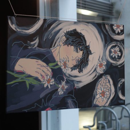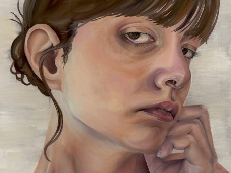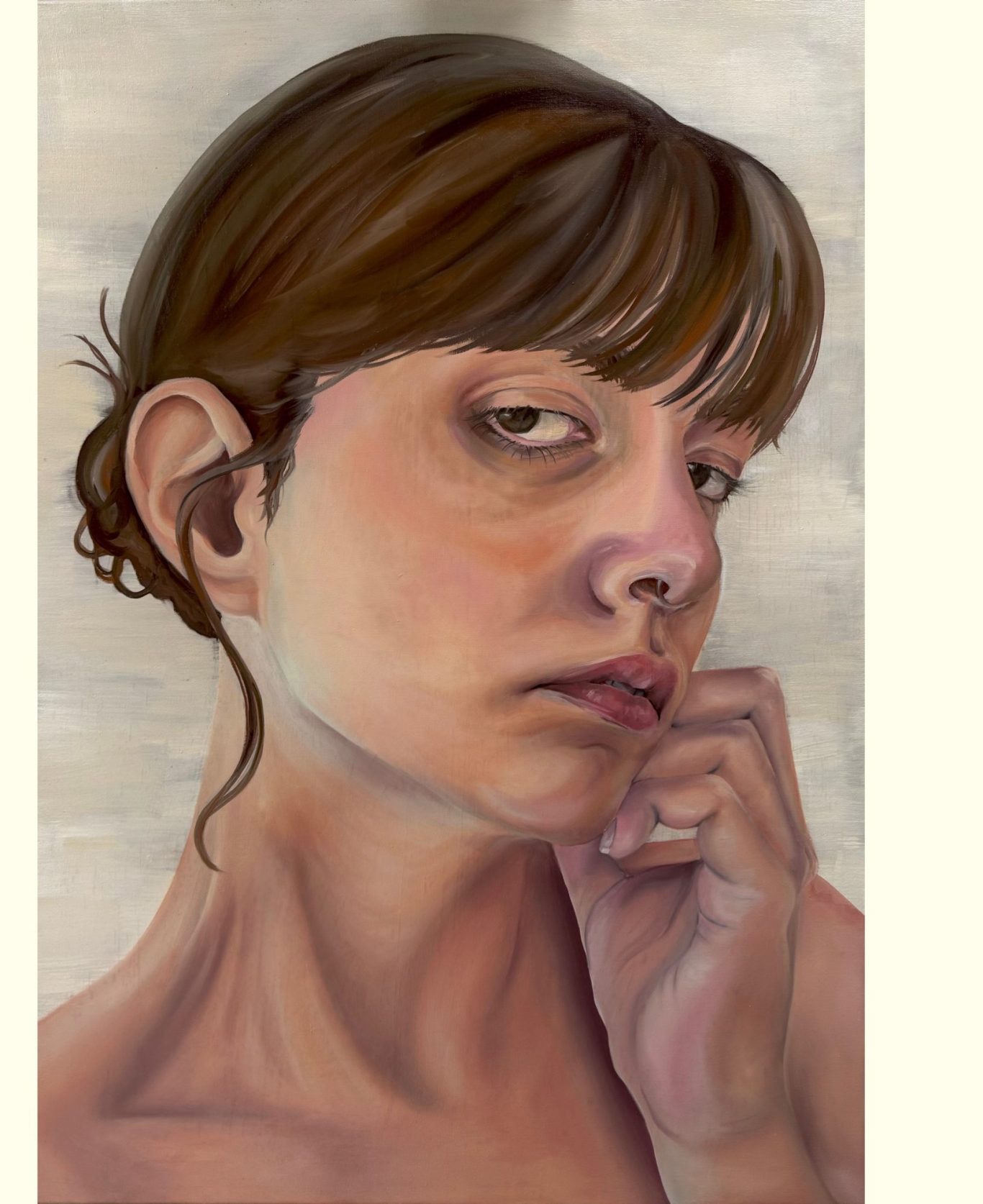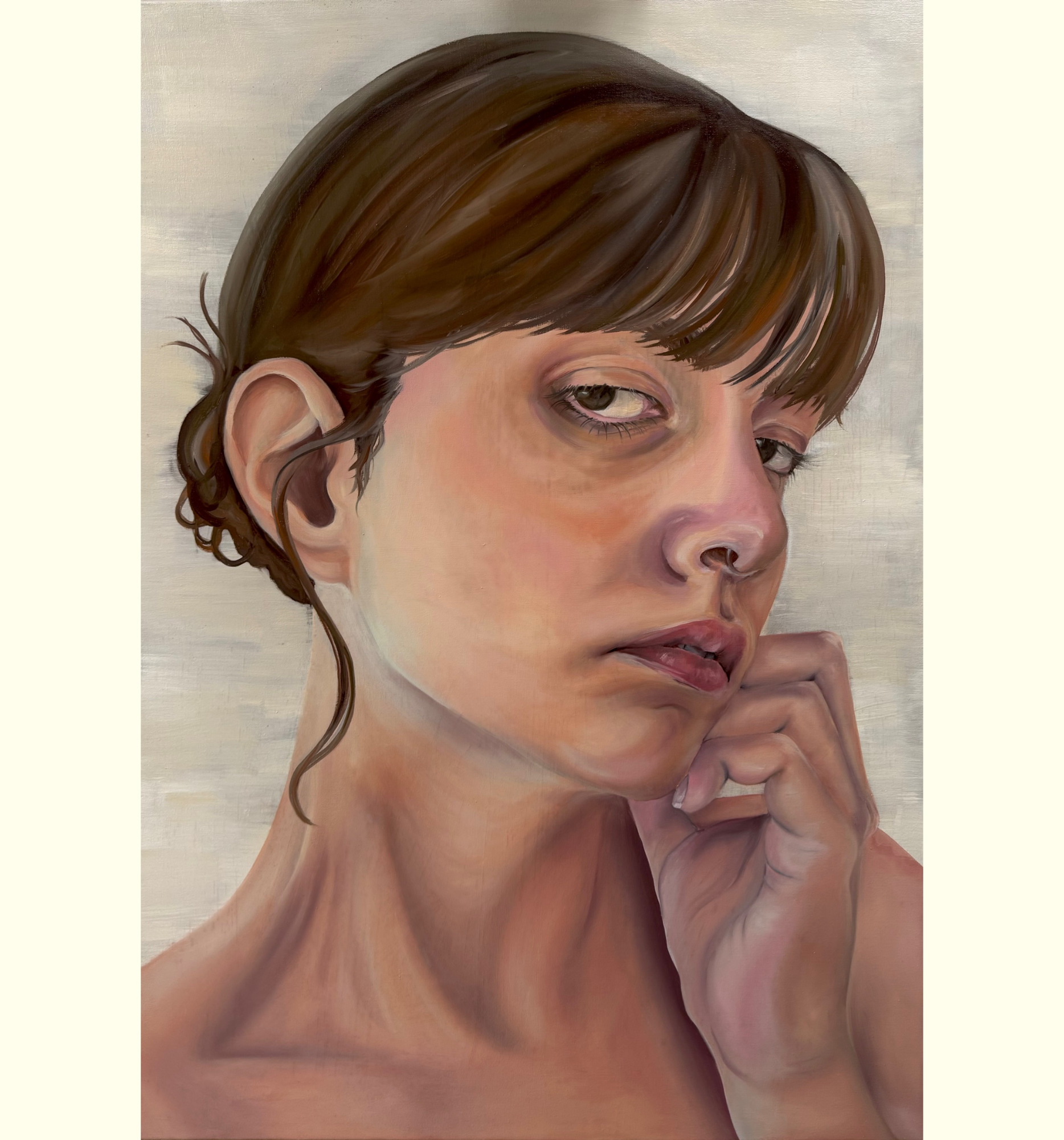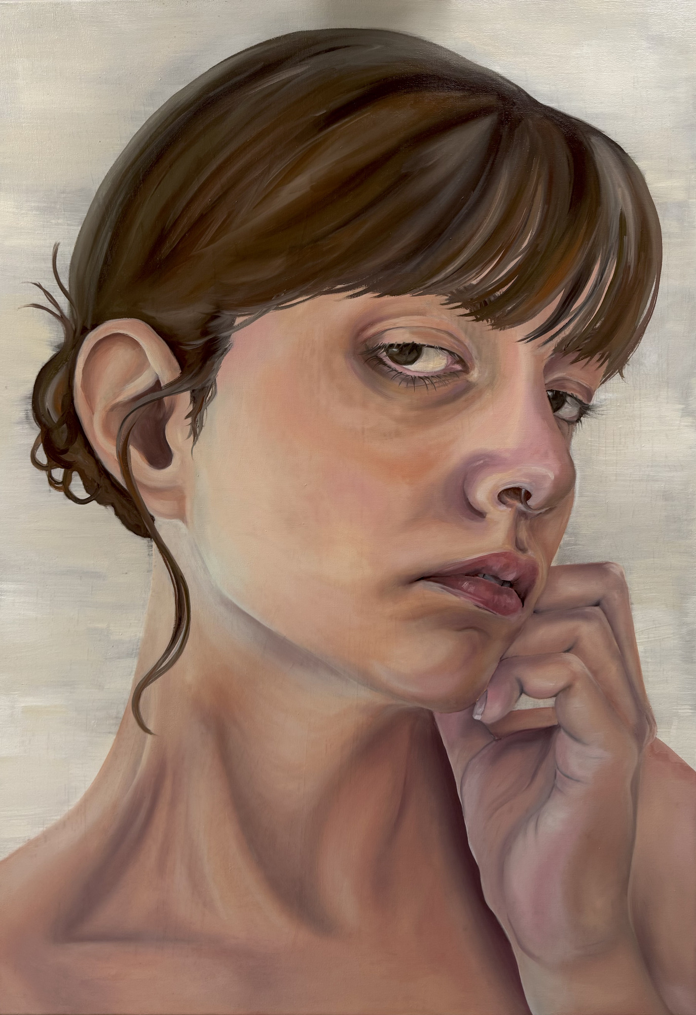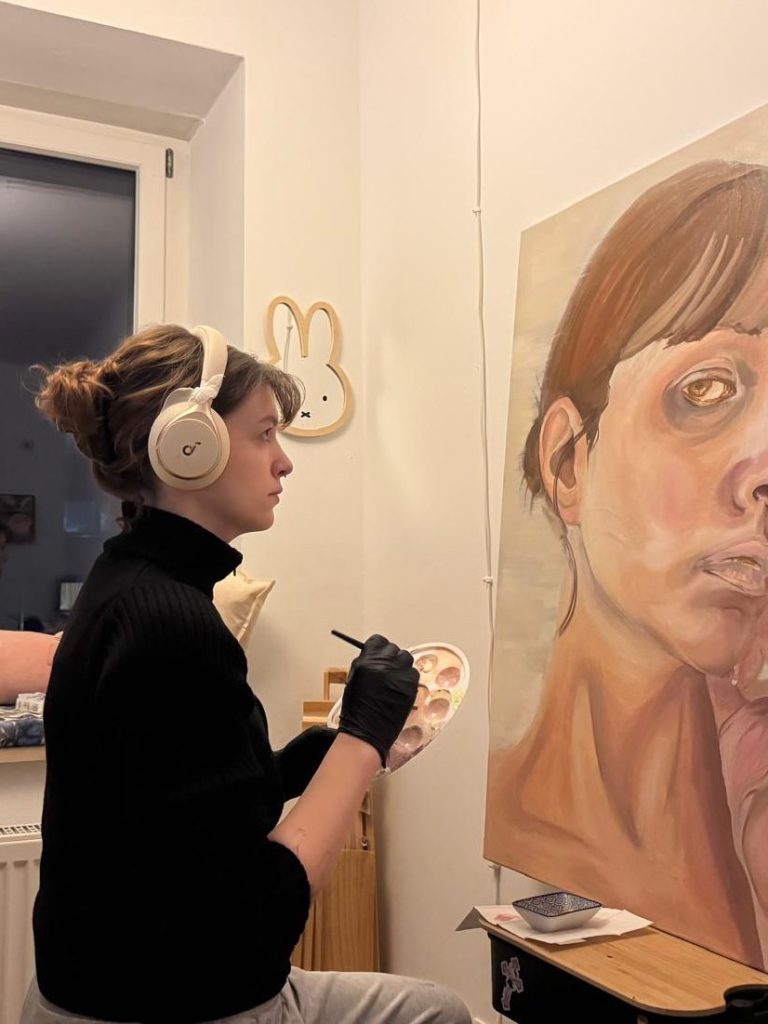 Wie wäre ich ohne mich? (Öl auf Leinwand, 70x100cm, 2025) verhandelt die Frage, was es bedeutet, als junge Frau in einer Gesellschaft zu bestehen, die konstante Anforderungen an das äußere Erscheinungsbild und das innere Befinden stellt.