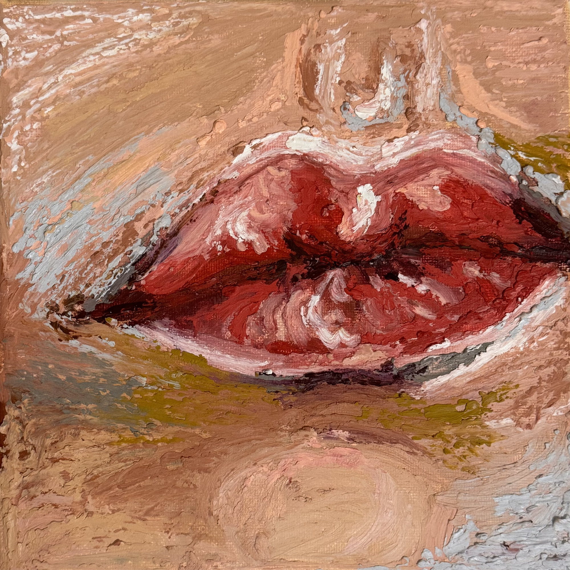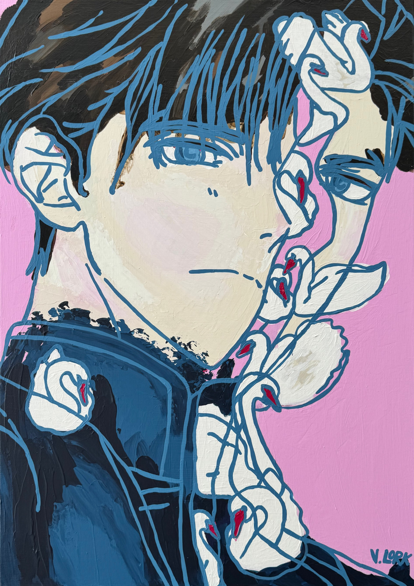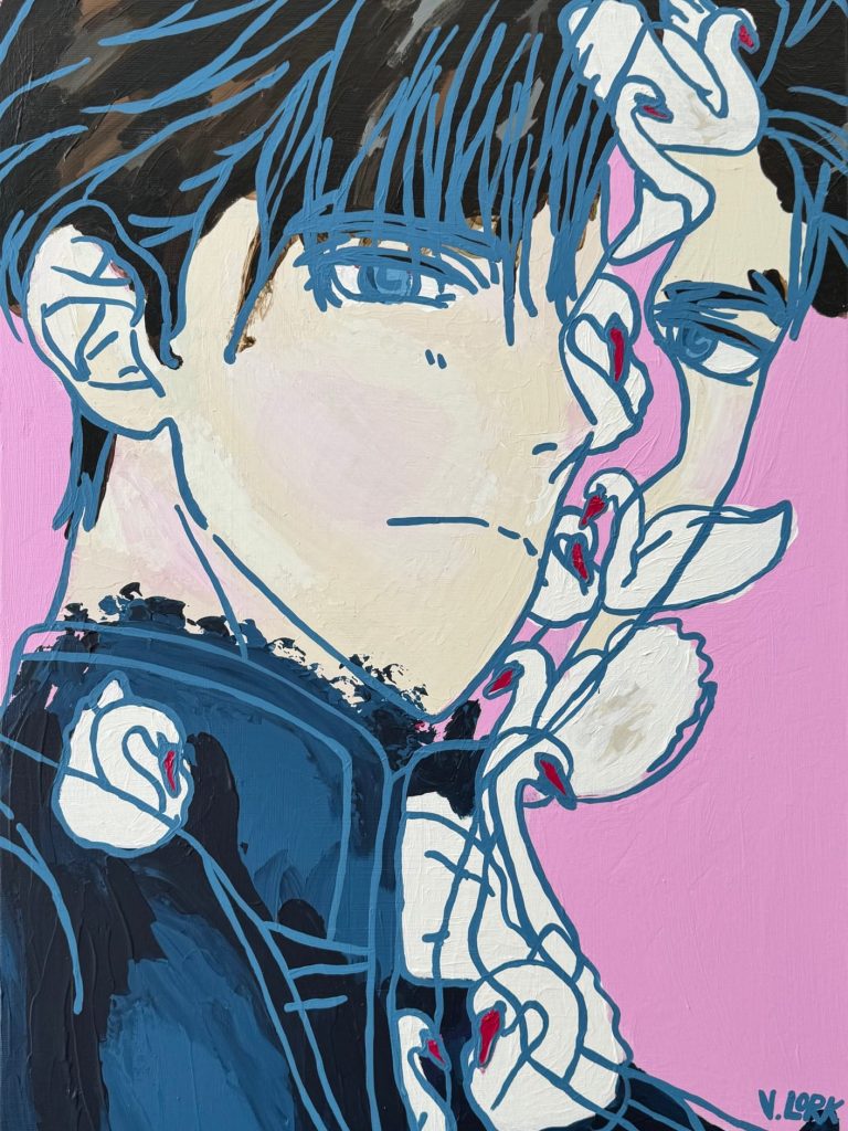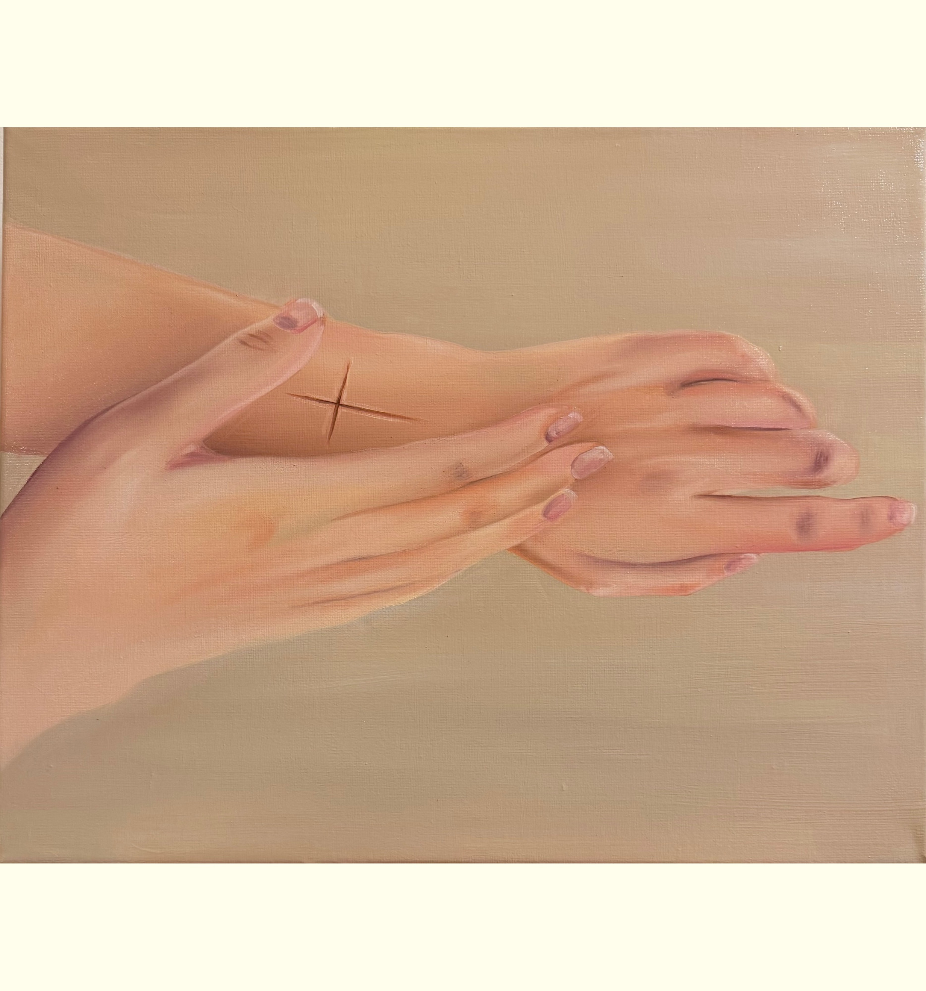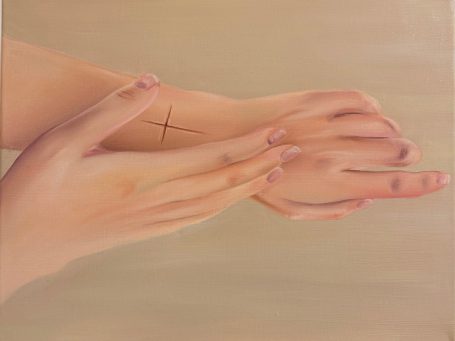 Schau hin (Öl auf Leinwand, 50x40cm, 2025) macht den Umgang mit dem eigenen Schmerz zwischen Sichtbarmachung, Scham und Selbstannahme sichtbar.