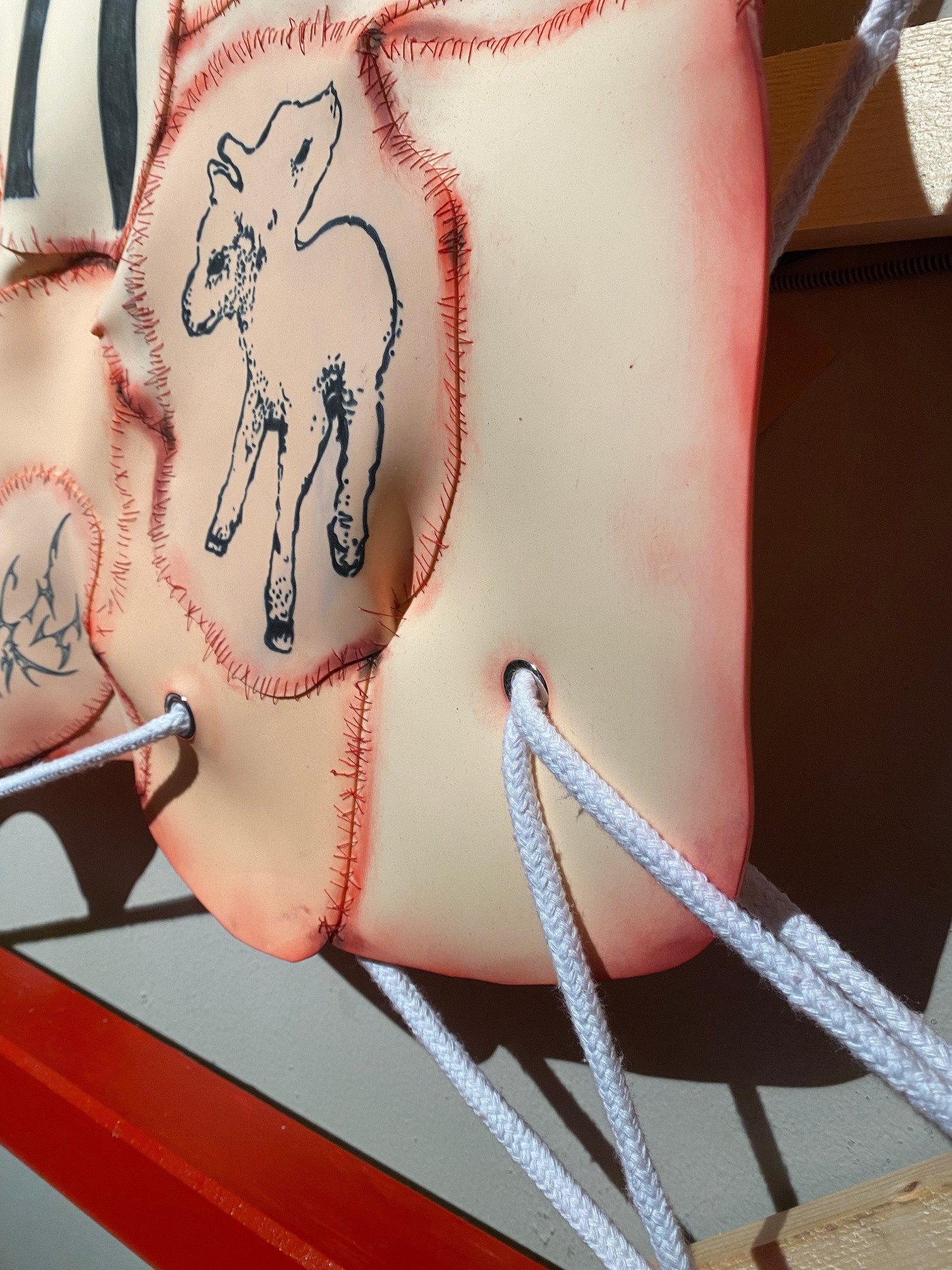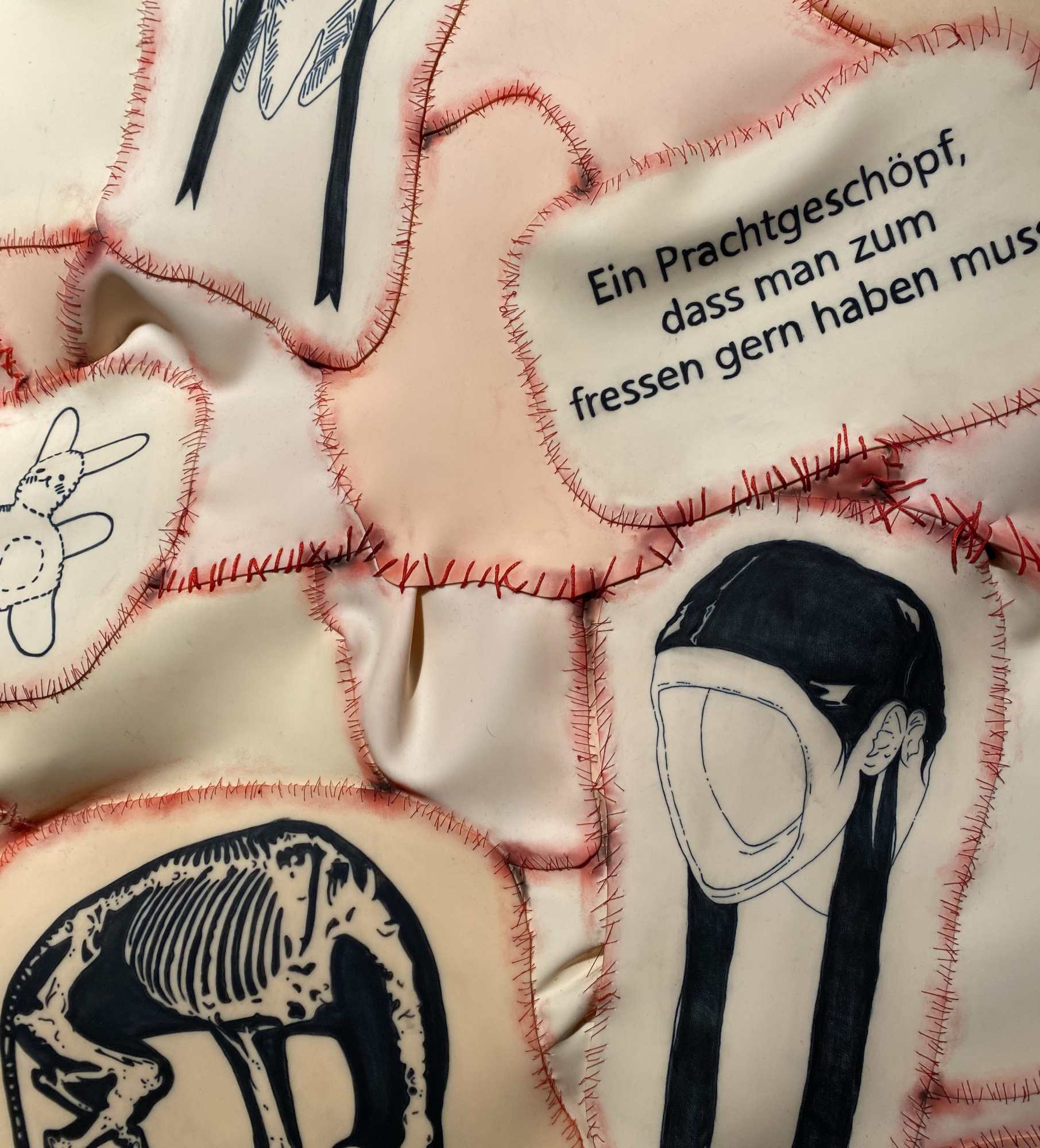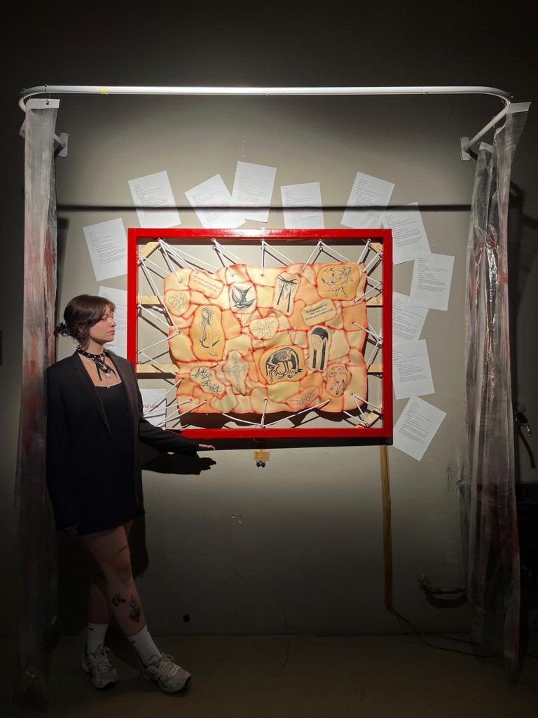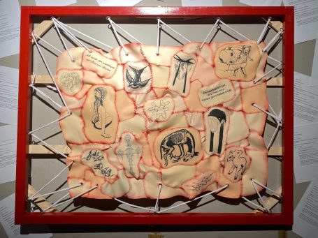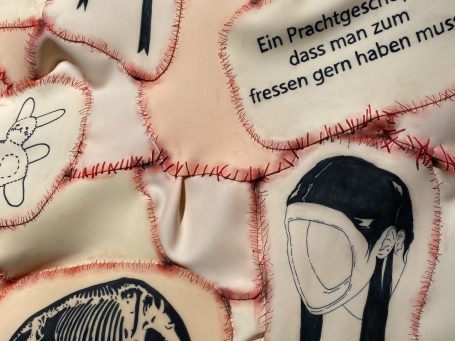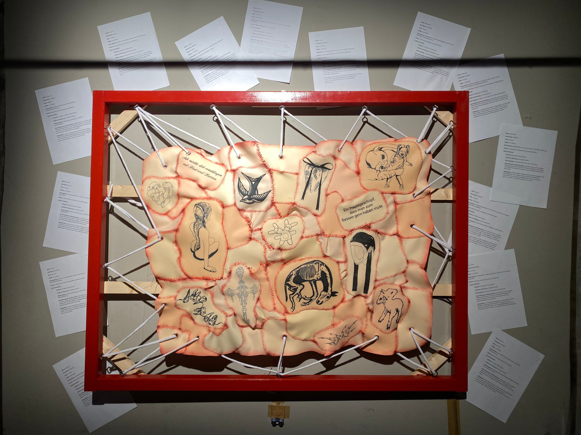 Der „Fleischteppich“ wurde von Verena selbst tätowiert und mit über 700 Metern Faden zusammengenäht. Auch der dazugehörige Rahmen ist eine eigensgebaute Sonderanfertigung.